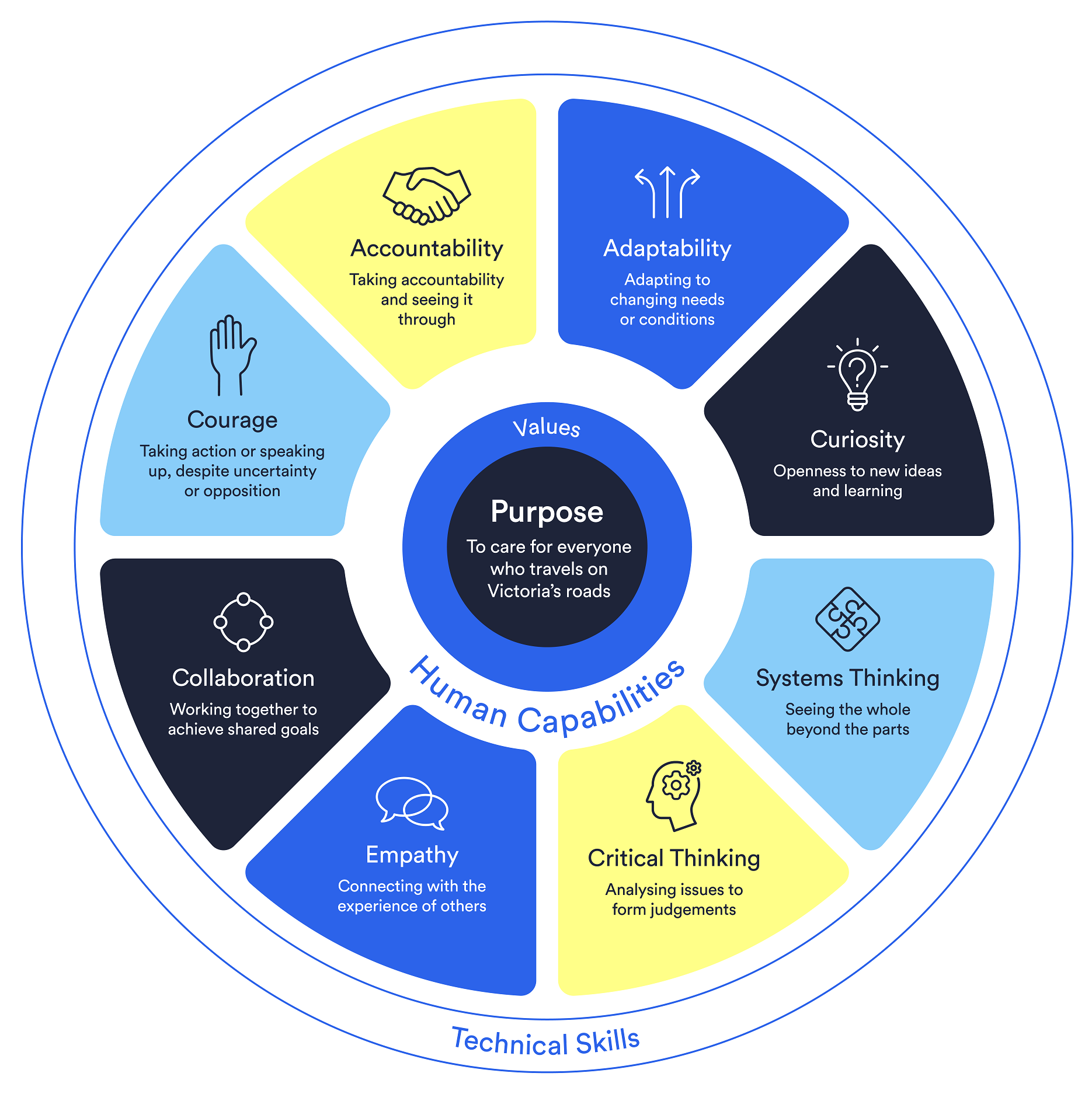 The TAC Capability Framework describes eight capabilities that are critical to our ongoing success and are important to developing a resilient and contemporary organisation. These capabilities apply to all roles and levels and emphasise the mindsets, behaviours and skills that support our purpose, vision, mission, strategy, values, and brand.