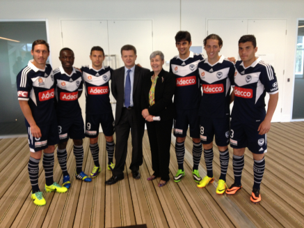 Pictured below: Melbourne victory players with Multicultural Affairs Minister Nicholas Kotsiras and TAC CEO Janet Dore