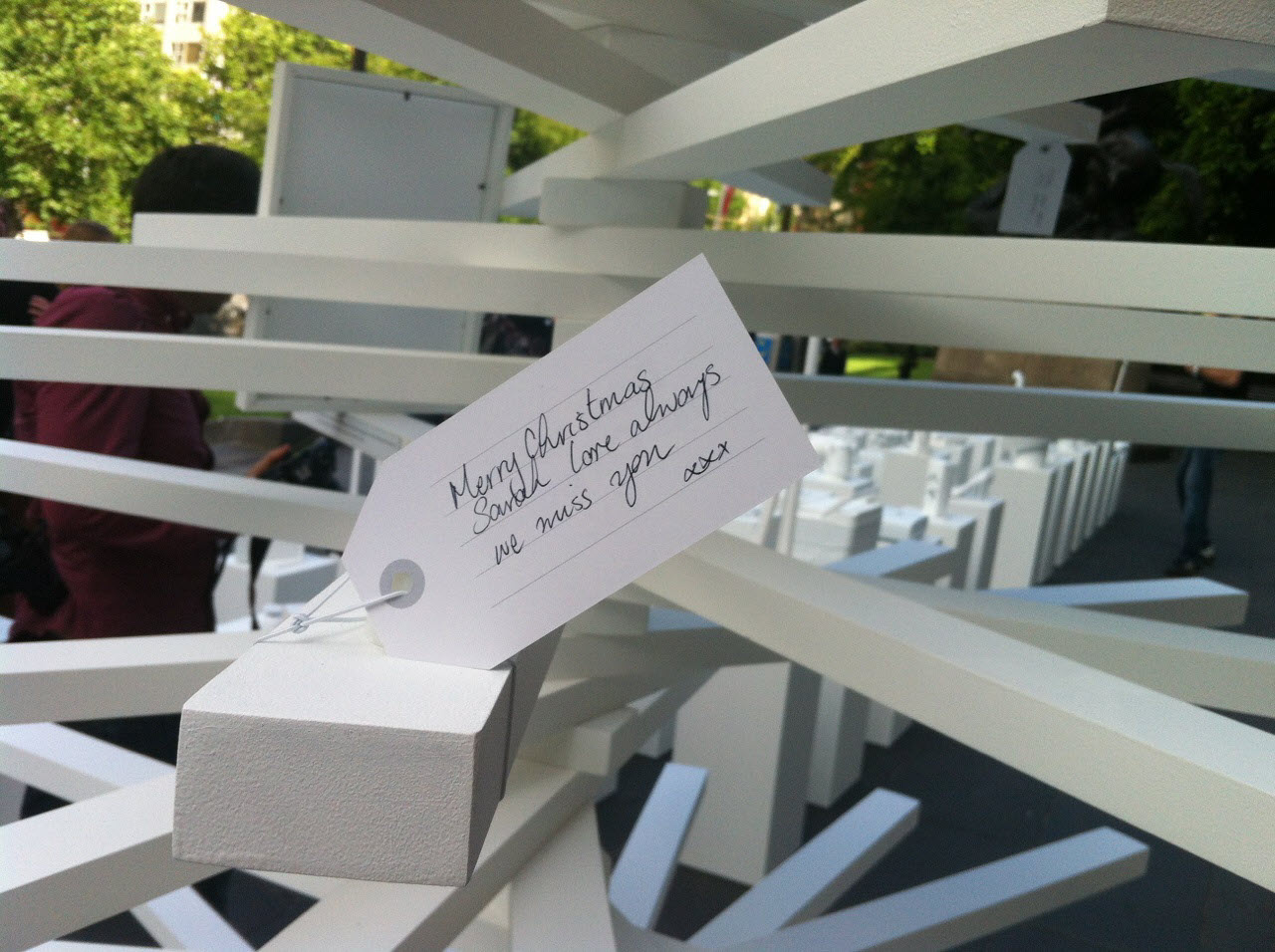 Ungiven Gifts will be in the State Library forecourt until Wednesday. Visitors can leave either a commitment to safe driving or a tribute to a loved one on the Christmas tree, or on Facebook.