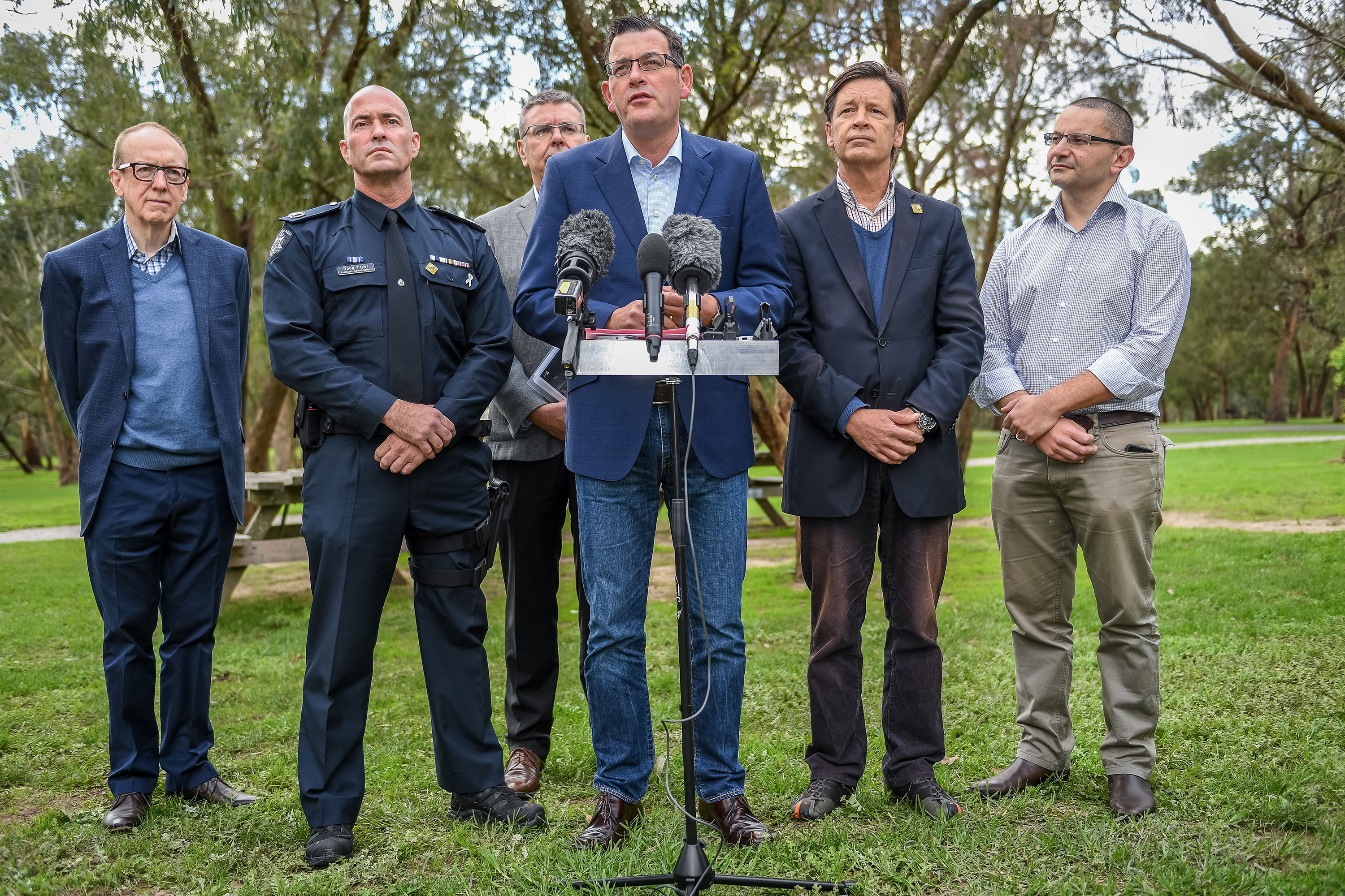 Premier Daniel Andrews announcing the Road Safety Strategy 2016-2020, with (clockwise from left): TAC chair John Walter, Assistant Commissioner Doug Fryer, Vic Roads chief executive John Merritt, Minister for Roads and Road Safety Luke Donnellan and TAC chief executive Joe Calafiore